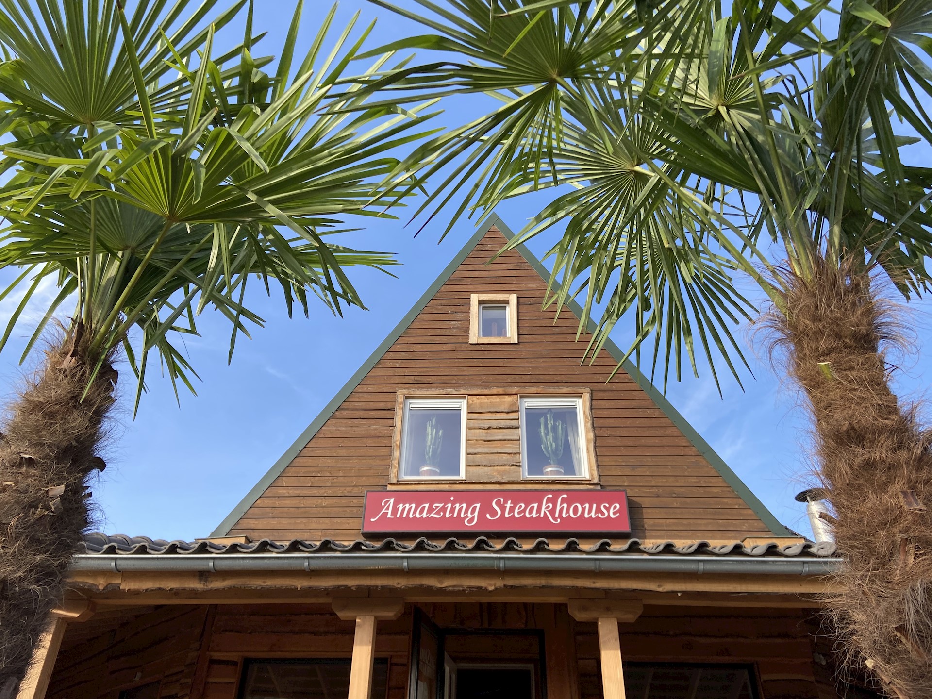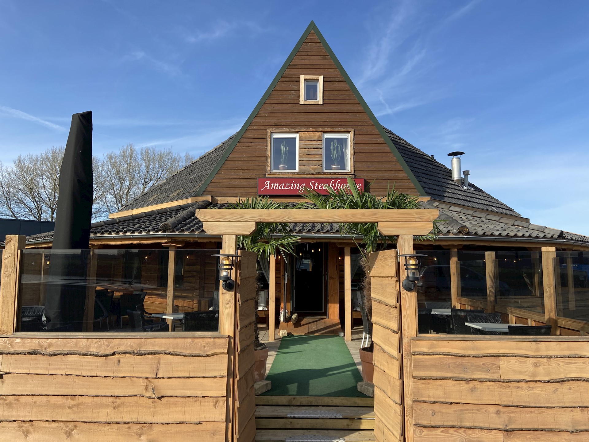 Onze lekkere gemarineerde spareribs, schnitzels zo groot als deurmatten, van uitstekende kwaliteit kipfilet, varkenshaas, tournedos, kalfsribeye, entrecote en natuurlijk de T-bone. Ook voor de grote eter hebben we verschillende enorme gerechten. Daarnaast is er ook een keuze uit diverse soorten vis, waaronder de zalmfilet en zeetongfilet. Natuurlijk wordt de vegetarische gast ook niet vergeten. Als de zon schijnt kunt u heerlijk vertoeven op ons omsloten terras, zodat u uit de wind, lekker kan genieten. Er is voldoende parkeergelegenheid.
